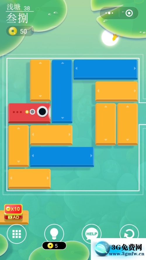 進入微信小游戲淺塘38級開始,游戲界面如下圖,顯然開始要移動最前(右)邊的豎黃色塊下移,然后將其左緊鄰的橫藍、黃色塊向前(右)移動。