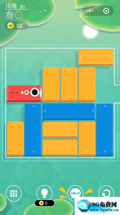 30級淺塘游戲開始的局面如下圖,要想讓紅色魚塊穿過池塘,則必須先移動最前端(右端)的藍色長條塊才行。如下圖1~2.