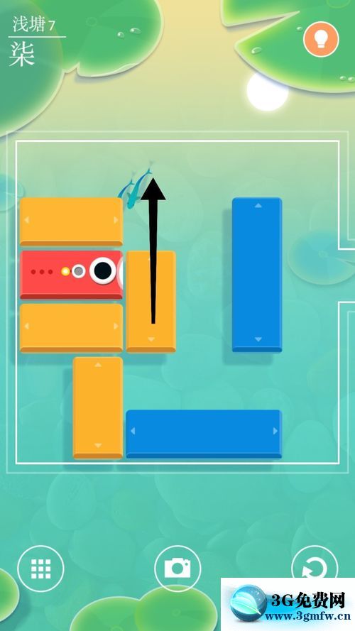 將圖中所選橙色方塊向左移動。將圖中所選橙色方塊向上移動。將小魚和圖中所選橙色方塊向右移動。先將圖中所選橙色方塊向上移動,再將圖中所選藍色方塊向左移動。將圖中所選藍色方塊向下移動。小魚成功逃脫啦~