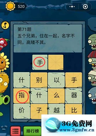 五個(gè)兄弟住在一起名字不同高矮不齊是微信小程序《腦筋急轉(zhuǎn)彎大亂斗》游戲第71關(guān)的問題,很多玩家還知道答案是什么,下面小編為大家?guī)砦⑿拍X筋急轉(zhuǎn)彎大亂斗第71關(guān)攻略。問題:五個(gè)兄弟住在一起名字不同高矮不齊。