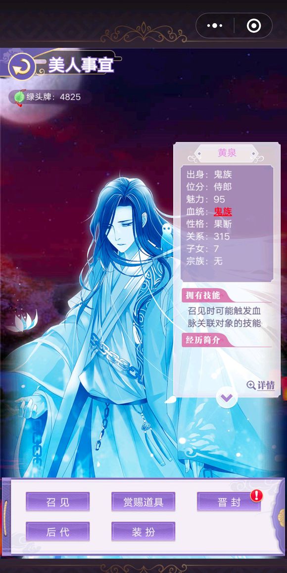 接下來,我們要看娃的反應。如圖,點擊美人事宜,出現自家妃子信息的這個界面,再點擊后代,找到剛出生的那只娃,點進去,我的這個娃反應就是扯頭發。