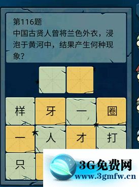 中國(guó)古賢人曾將蘭色外衣浸泡于黃河中結(jié)果會(huì)產(chǎn)生什么是微信小程序《腦筋急轉(zhuǎn)彎大亂斗》游戲第116關(guān)的問(wèn)題,很多玩家還知道答案是什么,下面小編為大家?guī)?lái)微信腦筋急轉(zhuǎn)彎大亂斗第116關(guān)攻略。