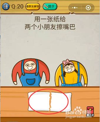 用一張紙給兩個小朋擦嘴巴是微信小程序《史上最強的大腦2》第20關的問題,很多玩家還不知道答案是什么,接下來小編為你帶來微信史上最強的大腦2第20關攻略。問題:用一張紙給兩個小朋擦嘴巴。