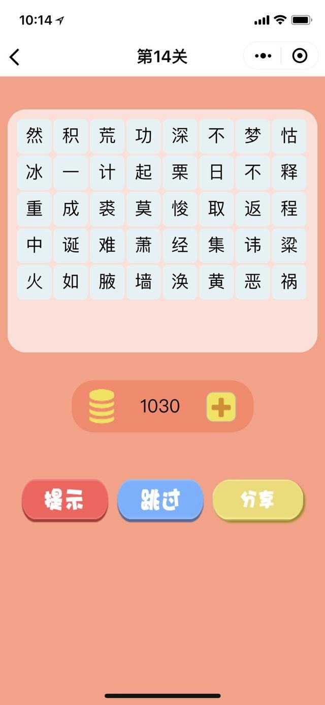 通過打亂的成語順序,拼湊出每個成語,難度適中,能很好的加深玩家的記憶能力并學習到更多新的成語。小程序類別:游戲開發者:深圳無忌網絡有限公司掃碼體驗小程序