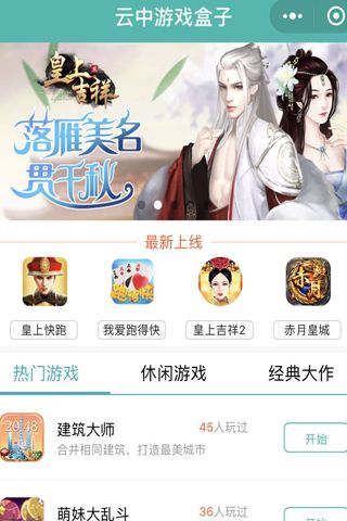 云中游戲盒子——全新超好玩的各類小游戲集合,讓你的休閑時間更有趣,運營活動日常開展,積分換福利,玩游戲賺話費、實物獎勵。 1.主推各類時下最熱門,最好玩,最潮流的小程序游戲。 2.各類積分福利,豪禮送不停小程序類別:游戲開發者:深圳云中信息技術有限公司掃碼體驗小程序