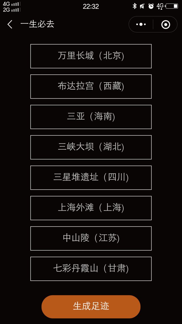 掃碼體驗小程序一生必去中國一生必去的100個地方,你去過幾個?小程序類別:工具開發者:個人小程序截圖