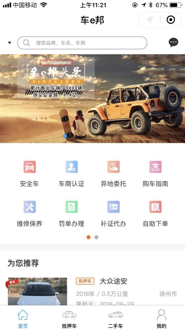 掃碼體驗小程序車e邦平臺專為足不出戶的用戶提供全方位的汽車服務項目。查違章、購買汽車配件、上保險等,快來使用車e邦,盡享優質服務。小程序類別:汽車小程序截圖
