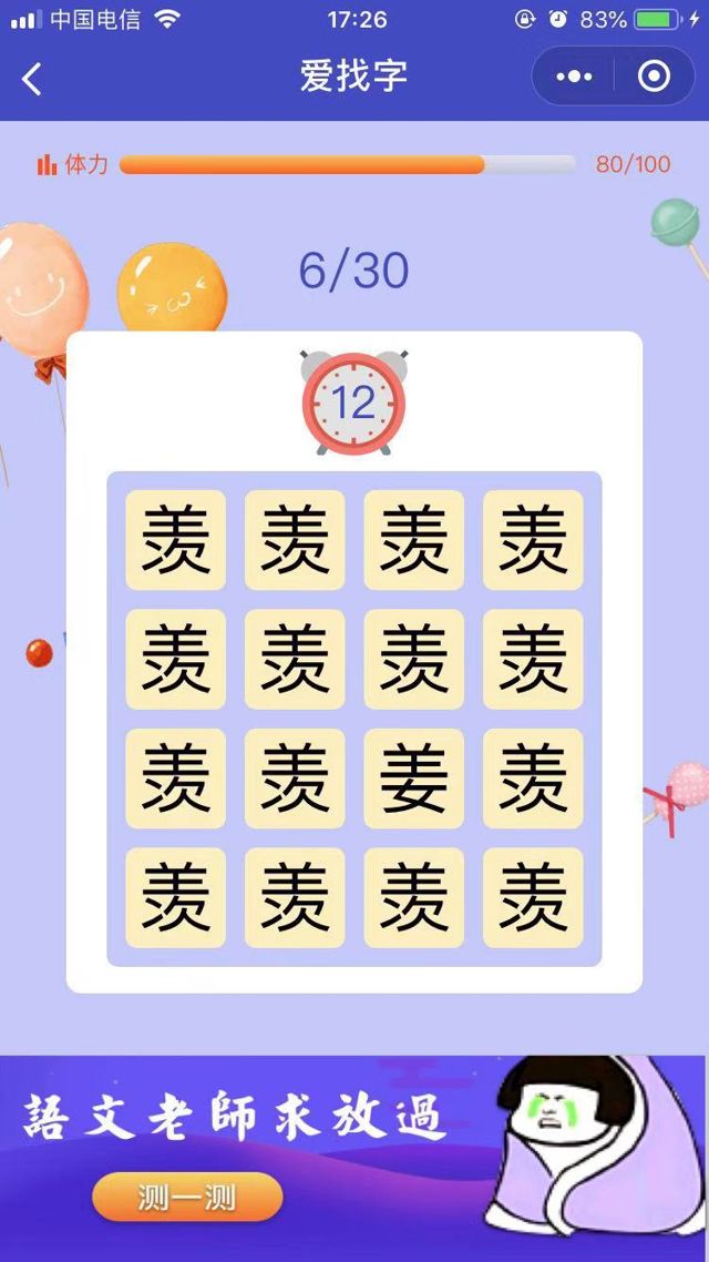 愛找字,找茬游戲新玩法,挑戰漢字極限,看看你的眼神還行嗎!小程序類別:游戲開發者:衡信網絡小程序截圖