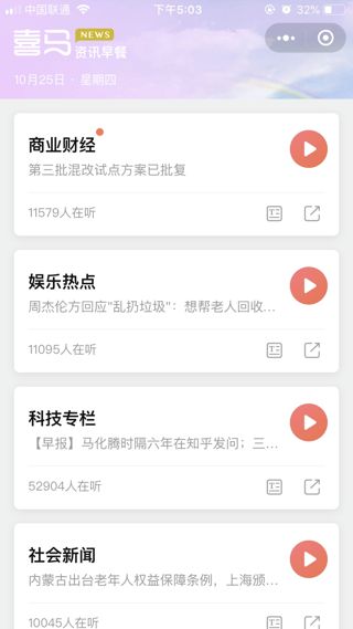 掃碼體驗小程序喜馬資訊早餐喜馬資訊早餐是喜馬拉雅FM官方出品的一款熱點資訊小程序。在這里可以第一時間收聽最新鮮熱門的資訊;可以關注你感興趣的資訊內容;更有微博,百度,知乎的特色專欄,讓你輕松一鍵聽。每天三分鐘,知曉天下事!小程序類別:內容資訊開發者:上海證大喜馬拉雅網絡科技有限公司小程序截圖