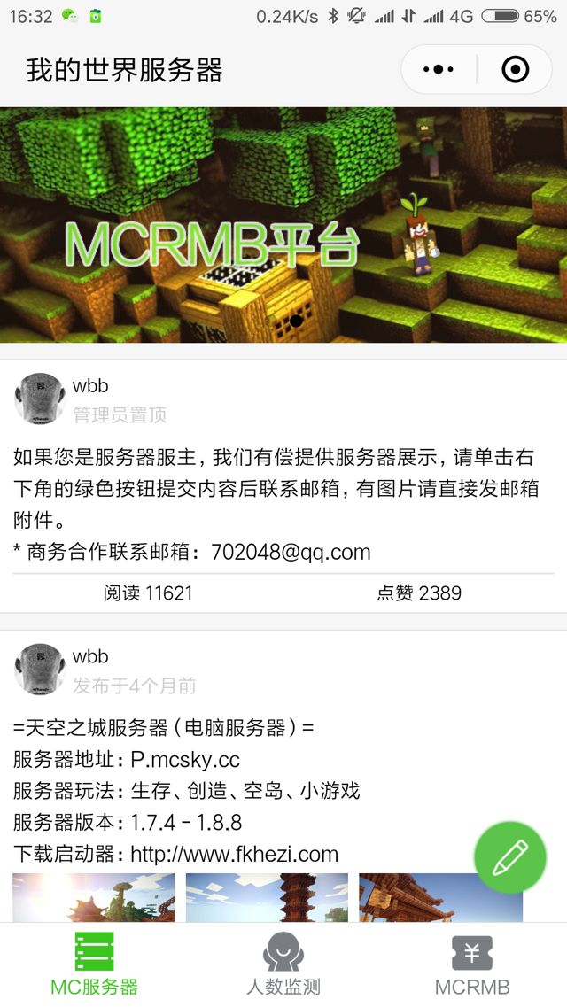 掃碼體驗小程序Minecraft我的世界: 合成表、面板服管理、Mcrmb管理、人數查詢、資訊分享、圈子交流小程序類別:工具開發者:廣州奔訊信息科技有限公司小程序截圖