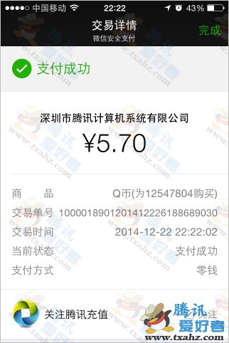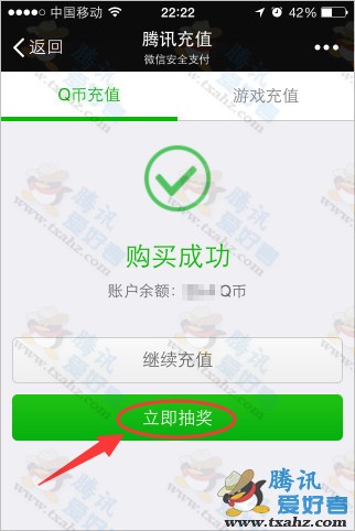 4、充值成功!微信是騰訊自家的軟件,充值Q幣自然也是秒到賬的!現在充值還有抽獎得Q幣活動。如下圖:
