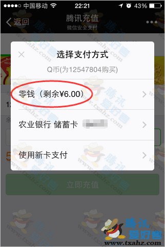 3、我們再點擊圖2中的“Q幣充值”,選擇充值數量后,支付時便可看到可以用零錢支付。如下圖: