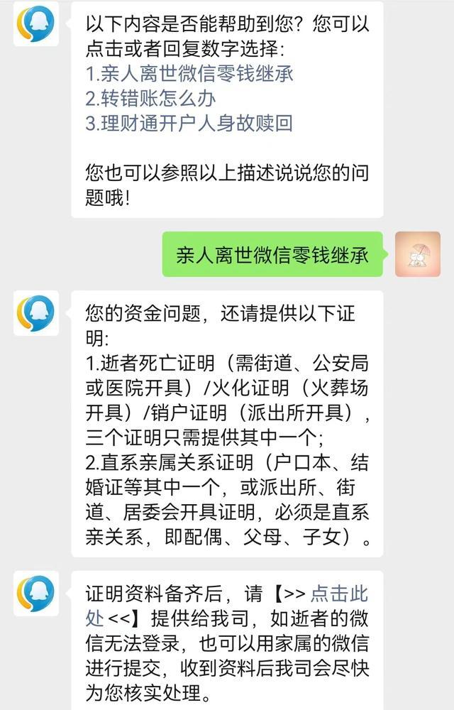 準備好上述資料后,在微信官網或者騰訊客服的微信公眾號中聯系客服,輸入口令“遺產繼承”,就會出現提交證明材料入口,點擊進入填寫好相關信息、上傳準備好的證明資料,然后等答復就行了,當然也可以使用家屬的微信提交證明資料。