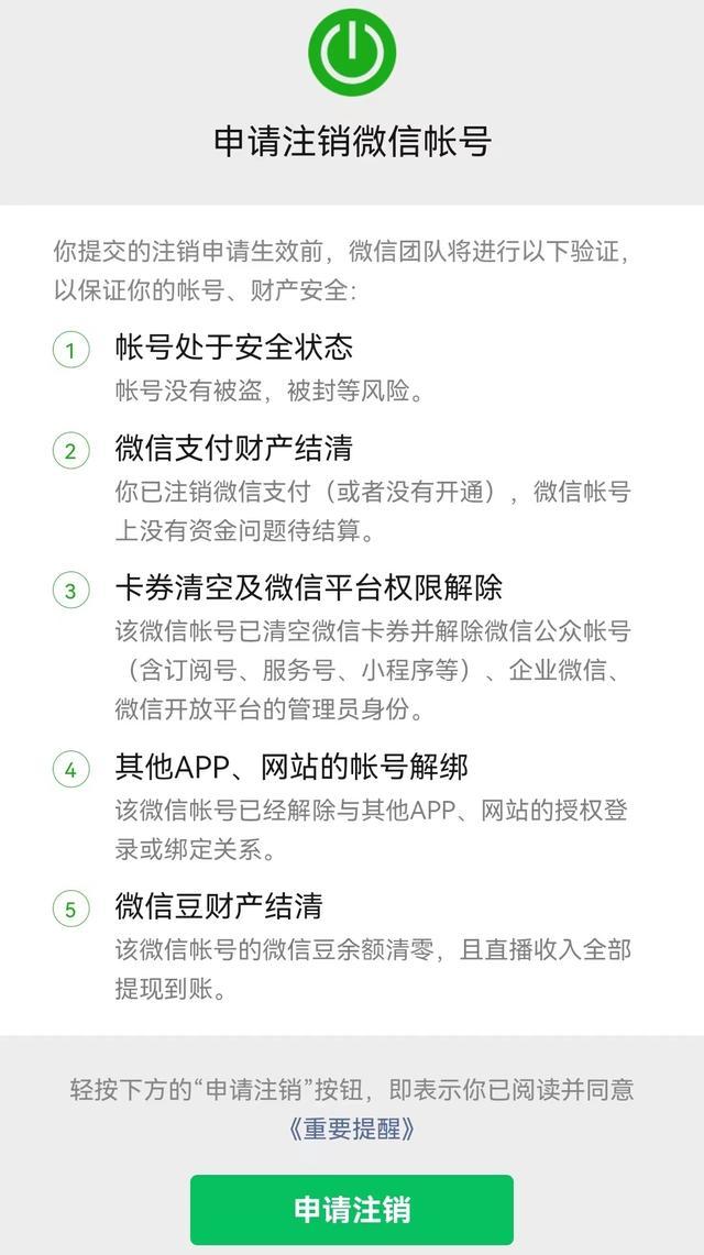 但在申請注銷賬號之前,需要做以下準備工作:注銷微信支付、卡券清空(公交卡以及優惠券等)、其他APP以及網站的賬號解綁、微信豆余額清零等,否則是無法申請注銷的。