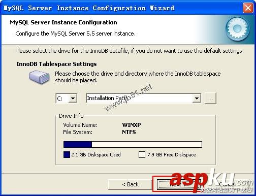 5、單擊Next按鈕,進(jìn)入InnoDB表空間配置對(duì)話框,這里可以為InnoDB數(shù)據(jù)文件選擇儲(chǔ)存位置,一般可以直接選擇默認(rèn),Drive info顯示了存放位置的分區(qū)信息,如圖所示: