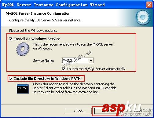 9、單擊Next按鈕,進(jìn)入用于設(shè)置Windows選項(xiàng)的對(duì)話框,在這里可以選擇將MySQL安裝為Windows服務(wù),并制定服務(wù)名稱,并允許命令行,設(shè)置了允許命令行后,就可以用命令行去操作MySQL了,如圖所示: