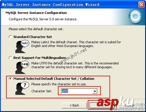 8、單擊Next按鈕,打開(kāi)用于設(shè)置MySQL默認(rèn)語(yǔ)言編碼字符集的對(duì)話框,該對(duì)話框提供了3種類型字符集,如果要支持中文,常用的選項(xiàng)有l(wèi)atin1、gb2312、gbk或者utf-8,如果都是英文字符,可以選擇latin1,如果要支持中文,可以選擇國(guó)標(biāo)gb2312或者gbk,如果要支持多國(guó)語(yǔ)言可以選擇utf-8,在這里選擇utf-8,從第三個(gè)選項(xiàng)下拉列表中選擇utf-8,選擇這個(gè)還有一個(gè)原因,就是用java去連接該數(shù)據(jù)庫(kù)的時(shí)候避免出現(xiàn)亂碼的問(wèn)題,如果出現(xiàn)了亂碼的話,在連接的url后面加上“?useUnicode=true&characterEncoding=UTF-8”如圖所示: