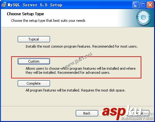 4、打開(kāi)Choose Setup Type對(duì)話框,在其中列出了3中安裝類型,分別是Typical、Custom和Complete。如果選擇Typical或Complete這兩種安裝方式,將進(jìn)入確認(rèn)對(duì)話框,確認(rèn)選擇并開(kāi)始安裝。如果選擇Custom,將進(jìn)入Custom(自定義)對(duì)話框。在這里選擇Custom,單擊Custom按鈕,如圖所示: