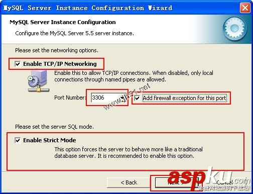7、單擊Next按鈕,進(jìn)入設(shè)置網(wǎng)絡(luò)選項(xiàng)對(duì)話框,在Networking Options對(duì)話框中可以啟用或禁用TCP/IP網(wǎng)絡(luò),并配置用來(lái)連接MySQL服務(wù)器的端口號(hào),默認(rèn)情況下啟用TCP/IP網(wǎng)絡(luò),默認(rèn)端口為3306,要想更改訪問(wèn)MySQL使用的端口,從下拉列表中選擇一個(gè)新端口或直接向下拉列表框中輸入新的端口好,但要保證選擇的端口號(hào)沒(méi)有被占用。如果選擇Add firewall exception for this port復(fù)選框,防火墻將允許通過(guò)該端口訪問(wèn),在這里選中該選項(xiàng)。如果選中Enable Strict Mode選項(xiàng),MySQL會(huì)對(duì)輸入的數(shù)據(jù)進(jìn)行嚴(yán)格的校驗(yàn),我個(gè)人認(rèn)為選中是一個(gè)好的選擇,這樣可以嚴(yán)格的遵守MySQL的規(guī)則,可以養(yǎng)成一個(gè)好習(xí)慣,如圖所示: