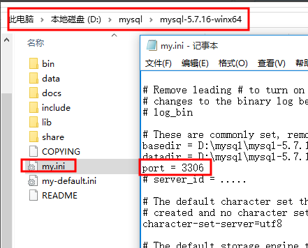 然后我們打開安裝目錄文件夾下的my.ini 配置文件 找到如圖所示的項 修改你想要的端口號 保存(這個也是很簡單的查看當前端口號的方法哦)