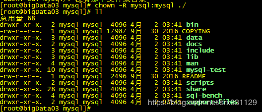 安裝完之后修改當前目錄擁有者為root用戶,修改data目錄擁有者為mysql