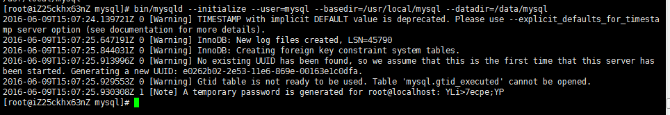 8、bin/mysqld --initialize --user=mysql --basedir=/usr/local/mysql --datadir=/usr/local/mysql/data ##進(jìn)入mysql文件名 basedir 為mysql 的路徑, datadir 為mysql的 data 包,里面 存放著mysql自己的包, 如user