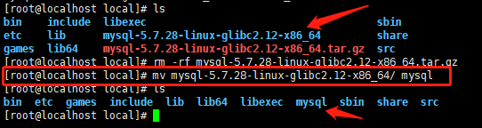 1.3 解壓完成后,將解壓后的文件更改名字為:mysql 輸入:mv mysql-5.7.28-linux-glibc2.12-x86_64.tar.gz mysql 命令將文件名更改,