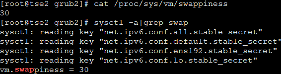 [root@tse2 grub2]# cat /proc/sys/vm/swappiness[root@tse2 grub2]# sysctl -a|grep swapsysctl: reading key "net.ipv6.conf.all.stable_secret"sysctl: reading key "net.ipv6.conf.default.stable_secret"sysctl: reading key "net.ipv6.conf.ens192.stable_secret"sysctl: reading key "net.ipv6.conf.lo.stable_secret"vm.swappiness = 30