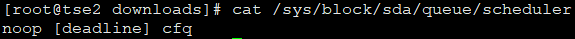 [root@tse2 downloads]# cat /sys/block/sda/queue/scheduler noop [deadline] cfq