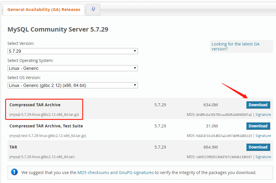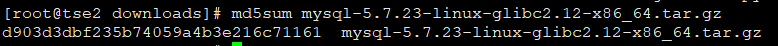 [root@tse2 downloads]# md5sum mysql-5.7.23-linux-glibc2.12-x86_64.tar.gz d903d3dbf235b74059a4b3e216c71161 mysql-5.7.23-linux-glibc2.12-x86_64.tar.gz