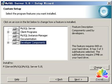 在“Developer Components(開發者部分)”上左鍵單擊,選擇“This feature, and all subfeatures, will be installed on local hard drive.”,即“此部分,及下屬子部分內容,全部安裝在本地硬盤上”。在上面的“MySQL Server(mysql服務器)”、“Client Programs(mysql客戶端程序)”、“Documentation(文檔)”也如此操作,以保證安裝所有文件。點選“Change...”,手動指定安裝目錄。