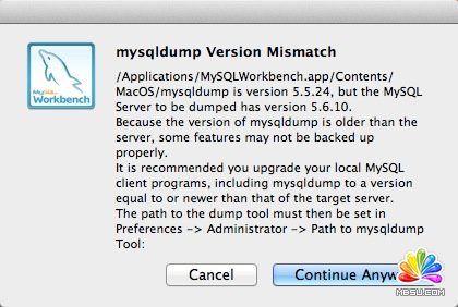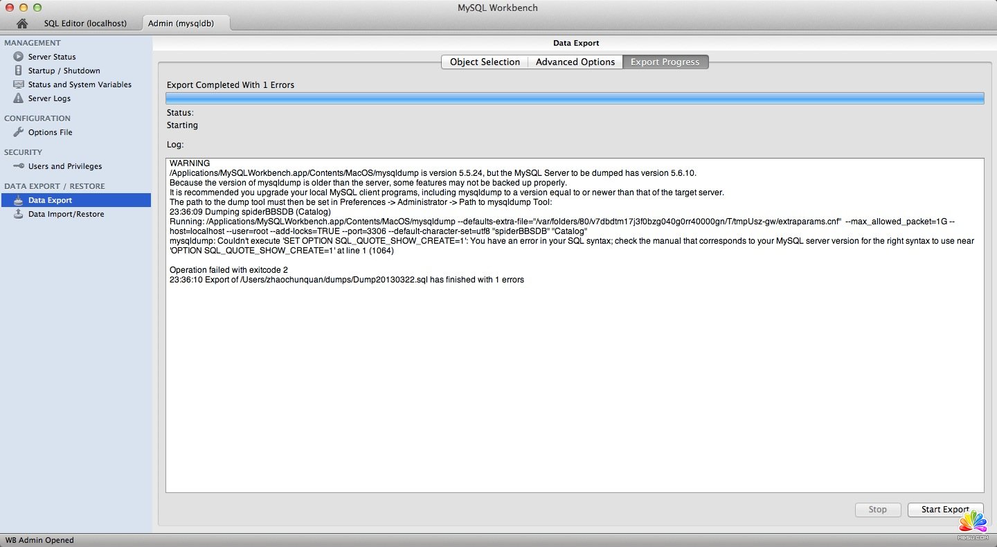 我想把本機數據庫內的數據遷移到另一臺機器上,于是使用Workbench中自帶的import/export功能,其實就是調用mysqldump。不幸的是,出現了版本不一致的錯誤。