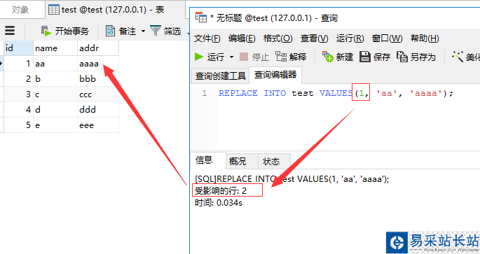 這里我們只指定id,name字段,我們來(lái)看看replace into后addr字段內(nèi)容是否還存在