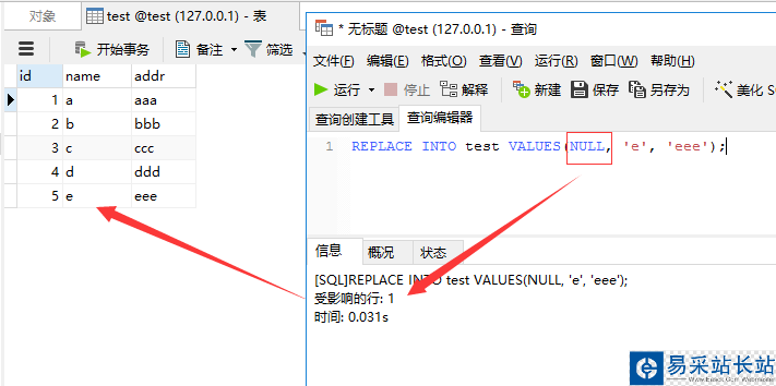 REPLACE INTO test VALUES(NULL, 'e', 'eee');