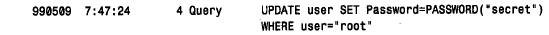 確保日志文件的安全且不被用戶任意讀取是個好注意。常規日志和更新日志都包含有諸如口令這樣的敏感信息,這是因為它們包含了查詢的文本。下面是您不想讓任何人都能讀取的日志項,因為它顯示了root 用戶的口令: