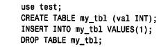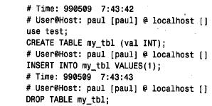 下面是一個實例,它是作為一個短客戶機會話的結果出現在常規日志中的信息中的,這個會話在test 數據庫中創建一個表,并插入一行到該表中,然后刪除該表: