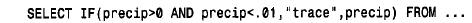 如果有人告訴您,某列需要記錄“降雨量”。那是一個數嗎?或者它“主要”是一個數值,即,一般是但不總是編碼成一個數嗎?例如,在看電視新聞時,氣象預報一般包括降雨量。有時是一個數(如“ 0 . 2 5”英寸的雨量),但是有時是“微量( t r a c e )”降雨,意思是“雨根本就不大”。這對氣象預報很合適,但在數據庫中怎樣存儲?有可能需要將“微量”量化為一個數,以便能用數值列類型來記錄降雨量,或許需要使用串,以便可以記錄“微量”這個詞。或者可以提出某種更為復雜的安排,使用一個數值列和一個串列,如果填充一個列就讓另一個列為null。很明顯,可能的話,應該避免最后這種選擇;最后這種選擇使表難于理解,使查詢更為困難。我們一般盡量以數值形式存儲所有的行,而且只為了顯示的需要才對它們進行轉換。例如,如果小于0.01英寸的非零降雨量被視為微量,那么可以如下選擇列值: