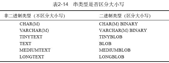根據定義串的方式,可以使串類型以區分大小寫或不區分大小寫的方式進行比較和排序。表2-14 示出不區分大小寫的每個類型及其等價的區分大小寫類型。根據列定義中給不給出關鍵字b i n a ry,有的類型(char、varchar)是二進制編碼或非二進制編碼的。其他類型(b l o b、t e x t)的“二進制化”隱含在類型名中。