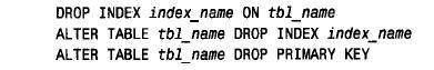 前兩條語句是等價的。第三條語句只在刪除primary key 索引時使用;在此情形中,不需要索引名,因為一個表只可能具有一個這樣的索引。如果沒有明確地創建作為primary key 的索引,但該表具有一個或多個unique 索引,則mysql將刪除這些unique 索引中的第一個。