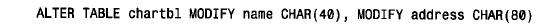 這里的問題是需要在相同的alter table 語句中一次更改所有的列。不可能一次一列地改完,或者說這個企圖將不起作用。如果執行describe chartbl,會發現兩個列仍然是varchar 的列!原因是如果每次更改一列, mysql注意到表仍然包含有可變長的列,則會把已經更改過的列重新轉換為varchar 以節省空間。為了處理這個問題,應該同時更改所有varchar 列: