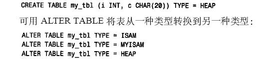 在mysql3.23 之前,所有用戶創建的表都利用的是isam 存儲方法。在mysql3.23中,可在create table 語句的列的列表之后指定type = type,以三種類型明確地創建表。其中type 可以為myisam、isam 或heap。例如: