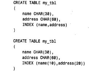 如果對某個串列的前綴進行索引(列值的最左邊n 個字符),應用column_list 說明符表示該列的語法為col_name(n) 而不用c o l _ name。例如,下面第一條語句創建了一個具有兩個char 列的表和一個由這兩列組成的索引。第二條語句類似,但只對每個列的前綴進行索引:
