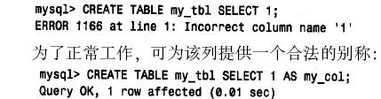 但創建空表時有幾點要注意。在創建一個通過選擇數據填充的表時,其列名來自所選擇的列名。如果某個列作為表達式的結果計算,則該列的“名稱”為表達式的文本。表達式不是合法的列名,可在mysql中運行下列查詢了解這一點: