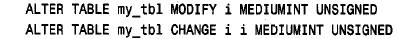 ■ 更改列類型。為了更改列的類型,可使用change 或modify 子句。假如表my _ t b l中的列為smallint unsigned 的,希望將其更改為mediumint unsigned 的列。用下面的任何一個命令都可完成此項工作: