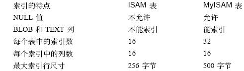 從此表中可以看到,對于isam 表來說,其索引列必須定義為not null,并且不能對blob 和text 列進行索引。myisam 表類型去掉了這些限制,而且減緩了其他的一些限制。兩種表類型的索引特性的差異表明,根據所使用的mysql版本的不同,有可能對某些列不能進行索引。例如,如果使用3.23 版以前的版本,則不能對包含null 值的列進行索引。