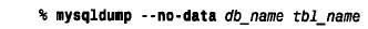 mysqldump 實用程序允許以create table 語句的形式查看表的結構。(與s h o wcolums 語句比較,作者認為mysqldump 命令的輸出結果更容易閱讀,而且這個輸出還顯示了表中的索引。)但如果使用mysqld um p,要保證用- no - data 選項調用它,以防被表中數據把頭搞暈。