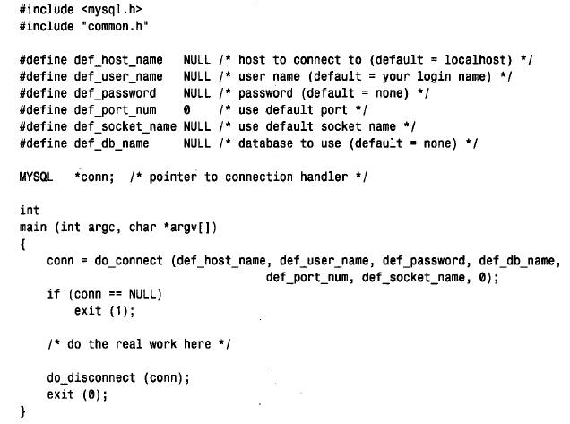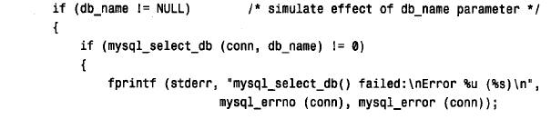 ■ 如果數據庫名稱是非null 的,則do_connect() 調用mysql_select_db() 使指定的數據庫為當前數據庫(這類似于沒有db_name 參數的效果)。如果沒有選擇這個數據庫,則do_connect() 打印一個錯誤消息,關閉連接,并返回null 來表示失敗。