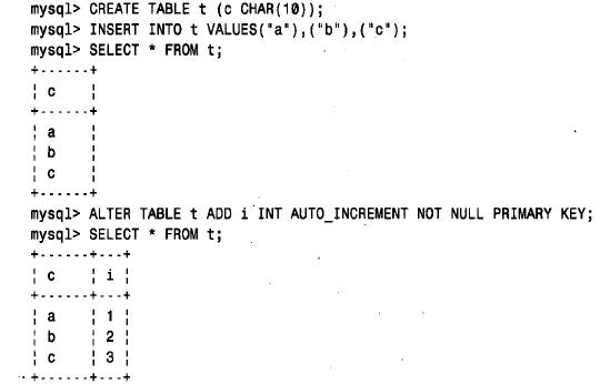 如果用alter table 增加auto_increment 列,則該列用序列號自動地填充。下面這組mysql會話中的語句示出了怎樣創建一個表,在其中存放數據,然后增加一個auto_increment 列:
