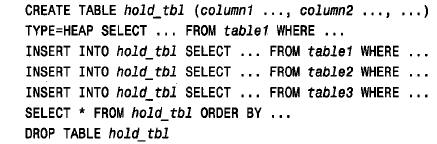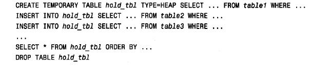 ■ 將每個表中的行選入一個臨時存儲表,然后選擇該表的內容。這樣可對行按所需的次序進行排序。在mysql3.23版及以后的版本中,可通過允許服務器創建存儲表來解決這個問題。而且,還可以使該表為臨時表,以便在您與服務器的會話結束時,自動刪除該表。