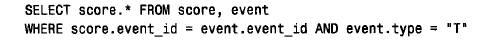 這里有一個問題要引起注意。此輸出列出了學生的id 和事件的id。student_id 列出現在student 和score 表中,因此,開始您可能會認為選擇列表可以給出student.student_id 或score . student _ id。但實際不是這樣,因為能夠找到感興趣記錄的基礎是所有學分表字段返回null。選擇score.student_id 將只在輸出中產生null 值的列。類似的推理可應用到event_id 列,它也出現在event 和score 表中。